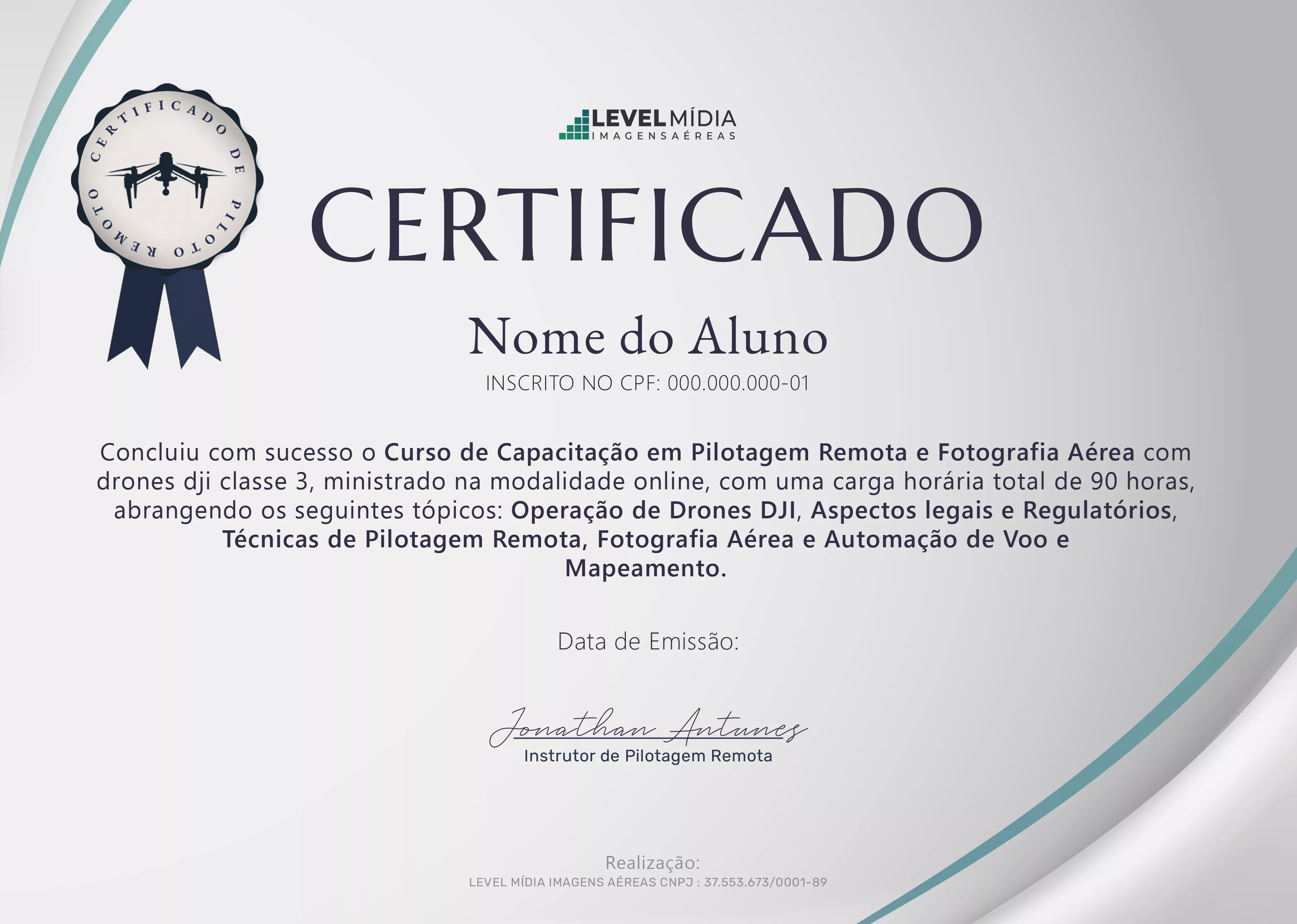 Ao concluir o treinamento, você receberá um certificado profissional de 90 horas, emitido pela Level Mídia Imagens Aéreas, comprovando sua habilidade em pilotagem remota e fotografia aérea com drones de Classe 3. Esse certificado serve como prova da sua capacitação para atuar no mercado de forma segura, legal e profissional.